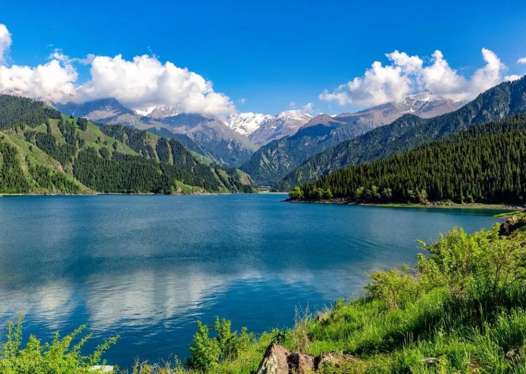 🏞️天山天池:瑤池景色如仙境,碧水映襯著山巒。